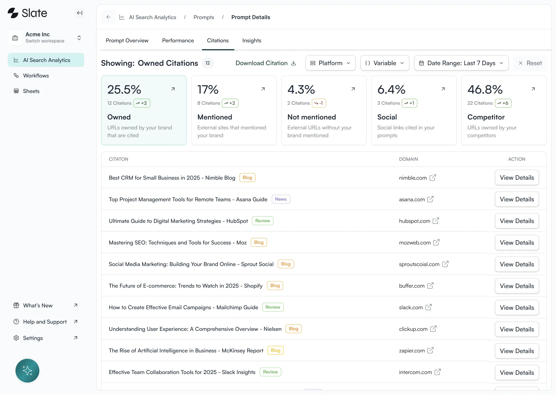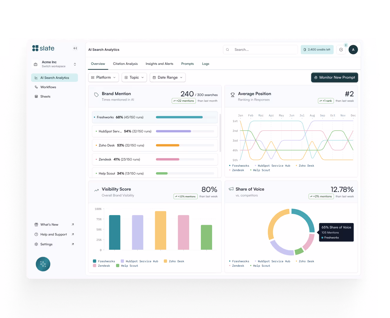 Slate analyzes millions of prompts to measure your visibility, track competitive share of voice, and share steps to optimize for citations.