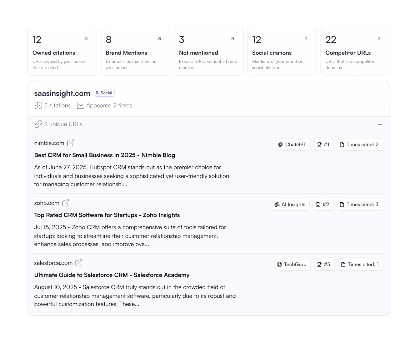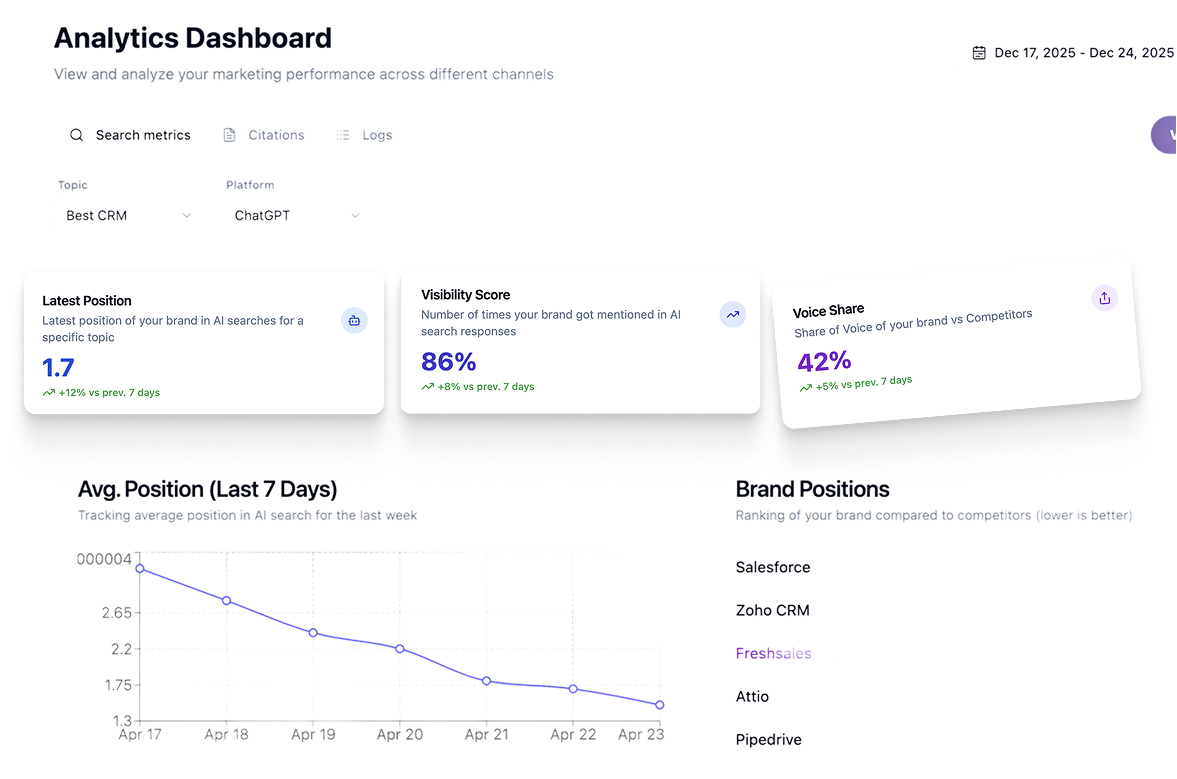 Track your brand across AI search. Understand how you're positioned, why you're cited (or not), and exactly what to do about it.